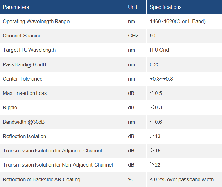 表1:永鼎光電子50GHz DWDM TFF參數(shù)指標(biāo)